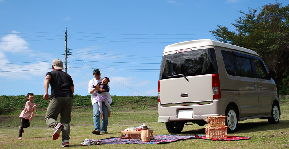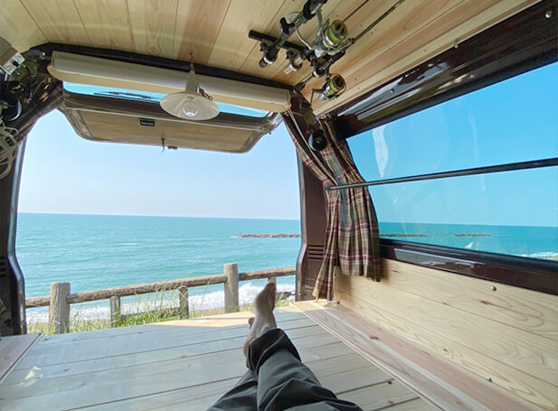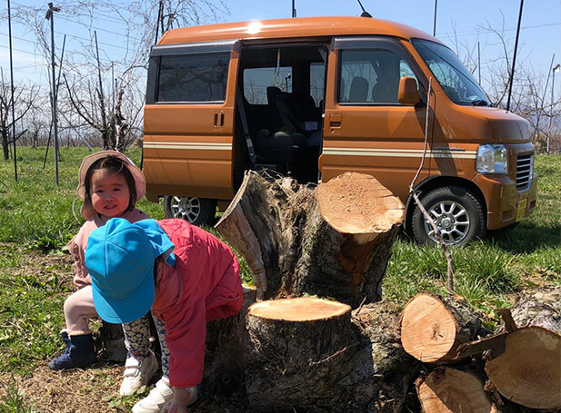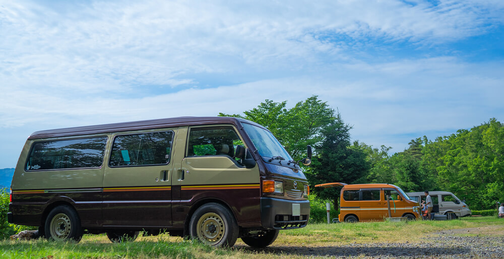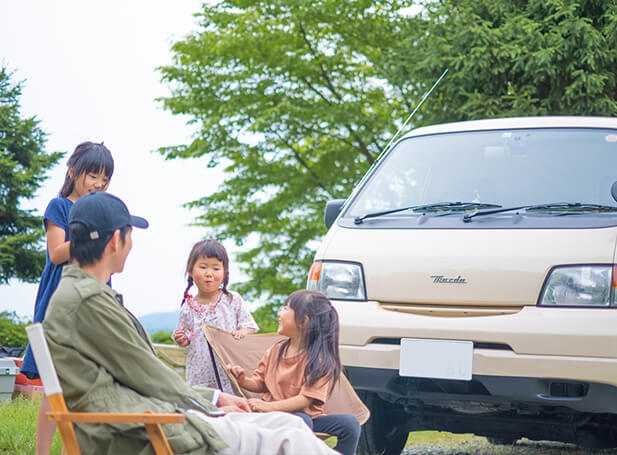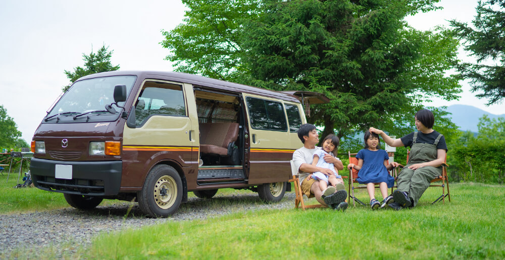 自身もペイントしたボンゴブローニィに乗り、家族と共にアウトドアやバンライフを楽しむ。