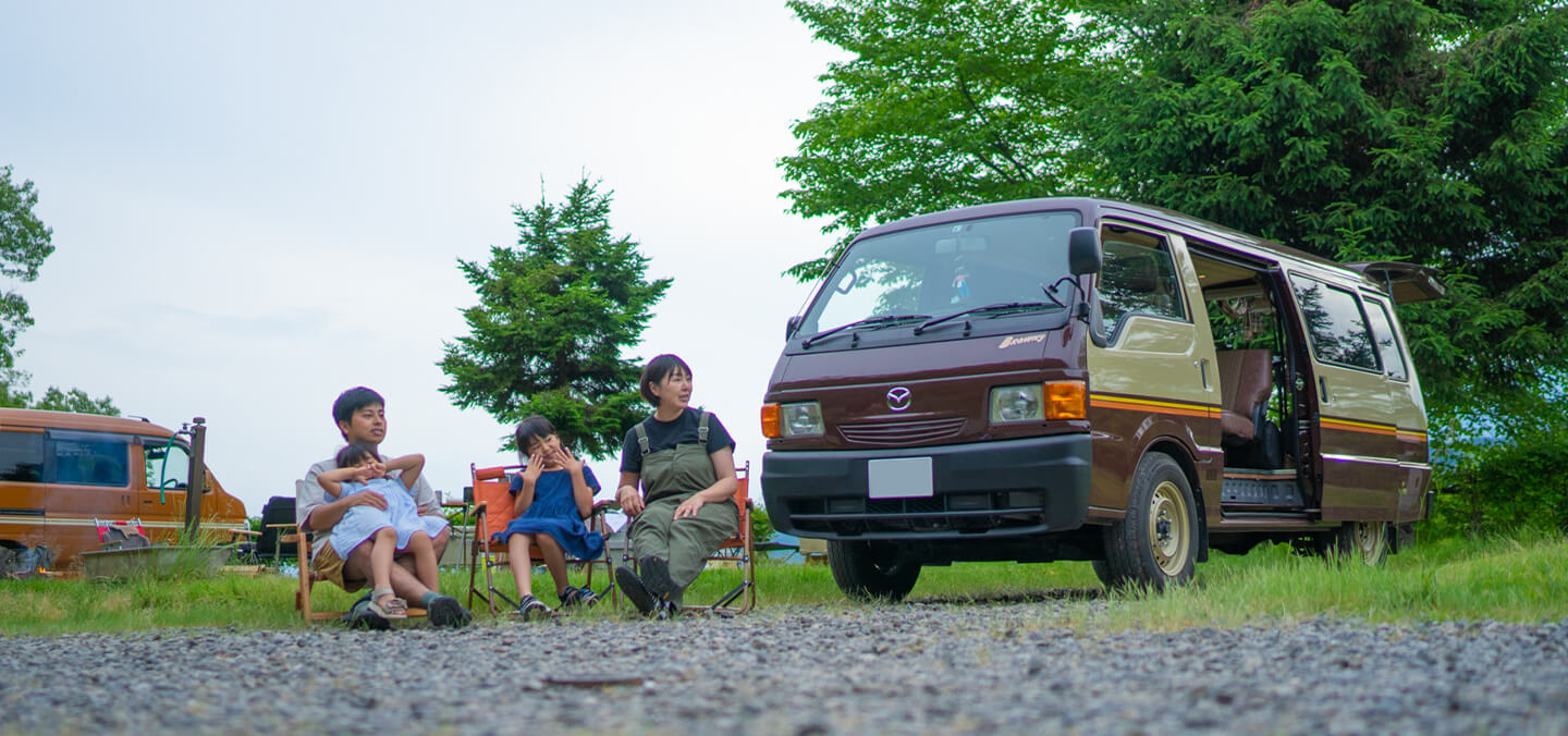 自身もペイントしたボンゴブローニィに乗り、家族と共にアウトドアやバンライフを楽しむ。